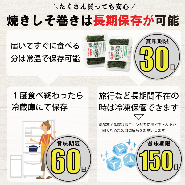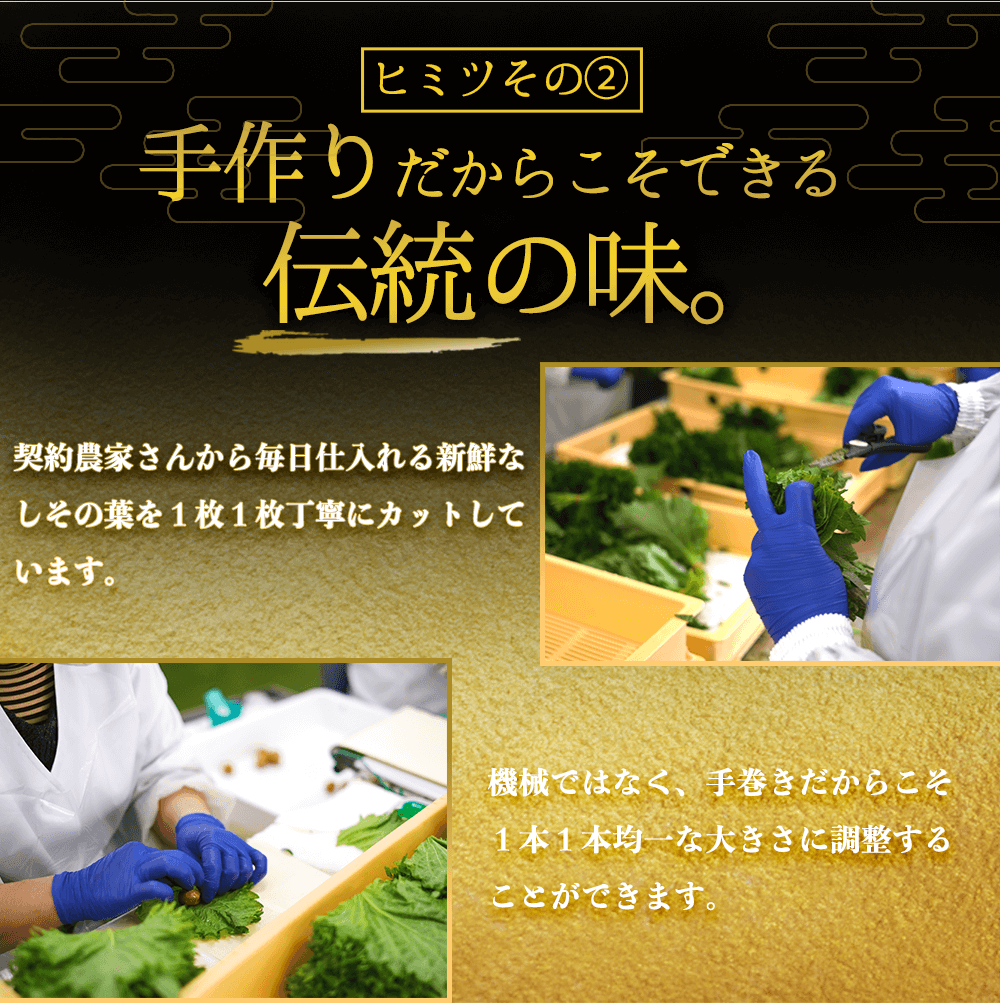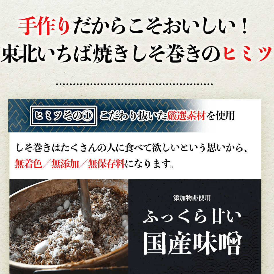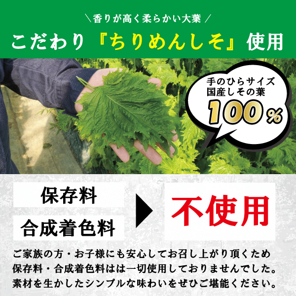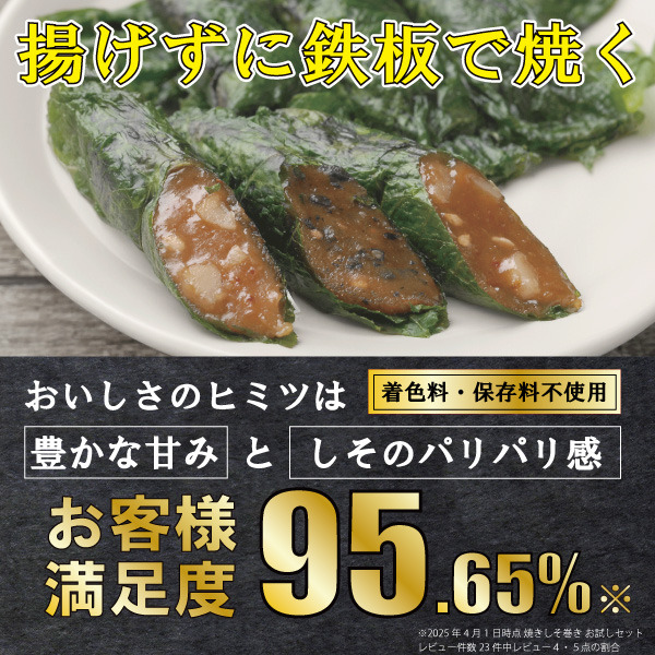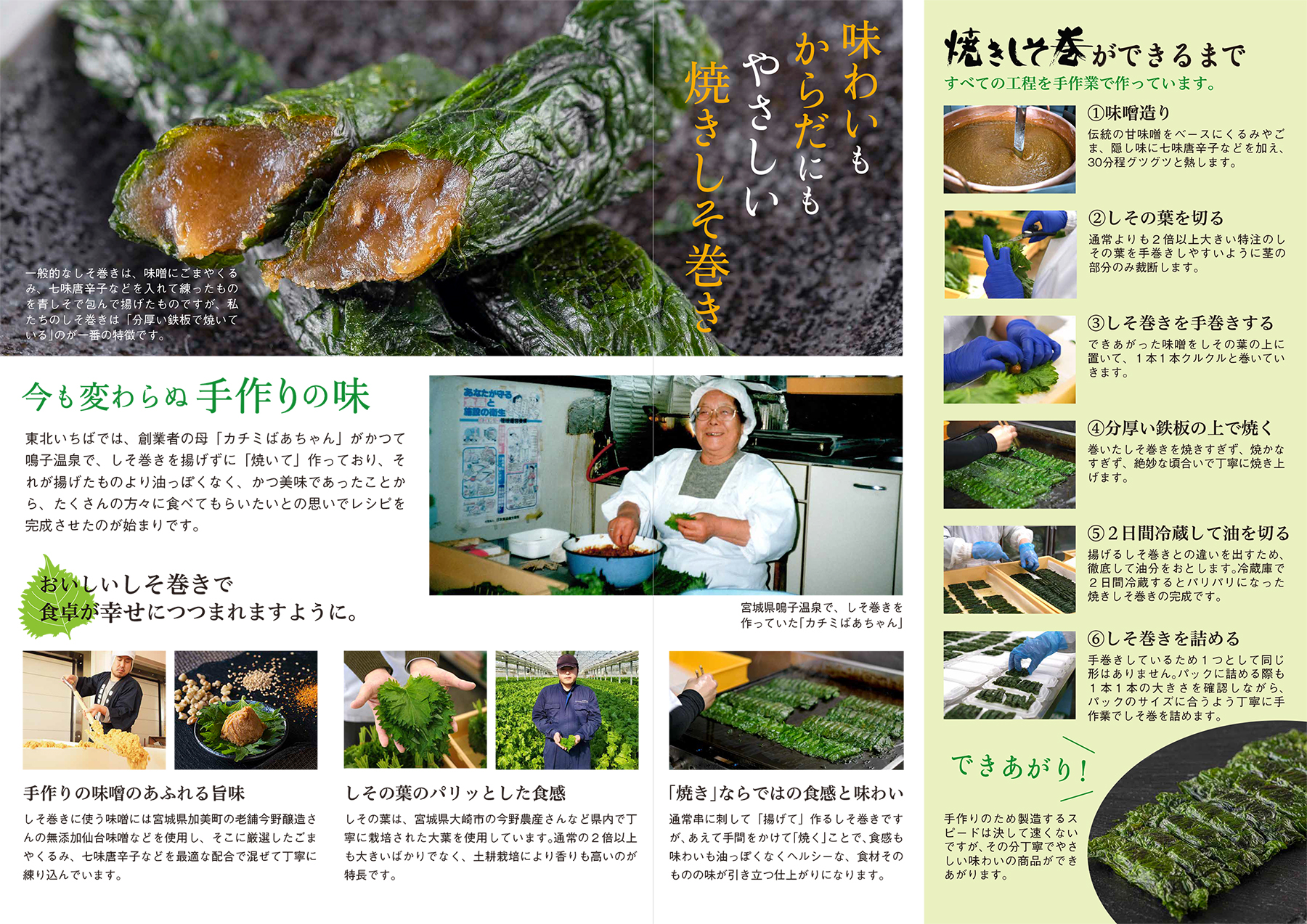 50年前から伝わる秘伝のレシピで製造・販売しております。分厚い鉄板で焼き上げる製法にこだわりひとくち食べるとしそのパリパリっとした食感を楽しむことができます。またたくさんの人々に食べて頂きたいという想いから、原料は着色料、保存料を使用しておりません。