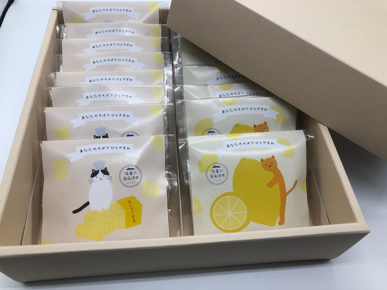 かわいい猫が描かれたパッケージが特徴の「ねことバタークッキー」と「ねことレモンクッキー」の16枚入りセットです。