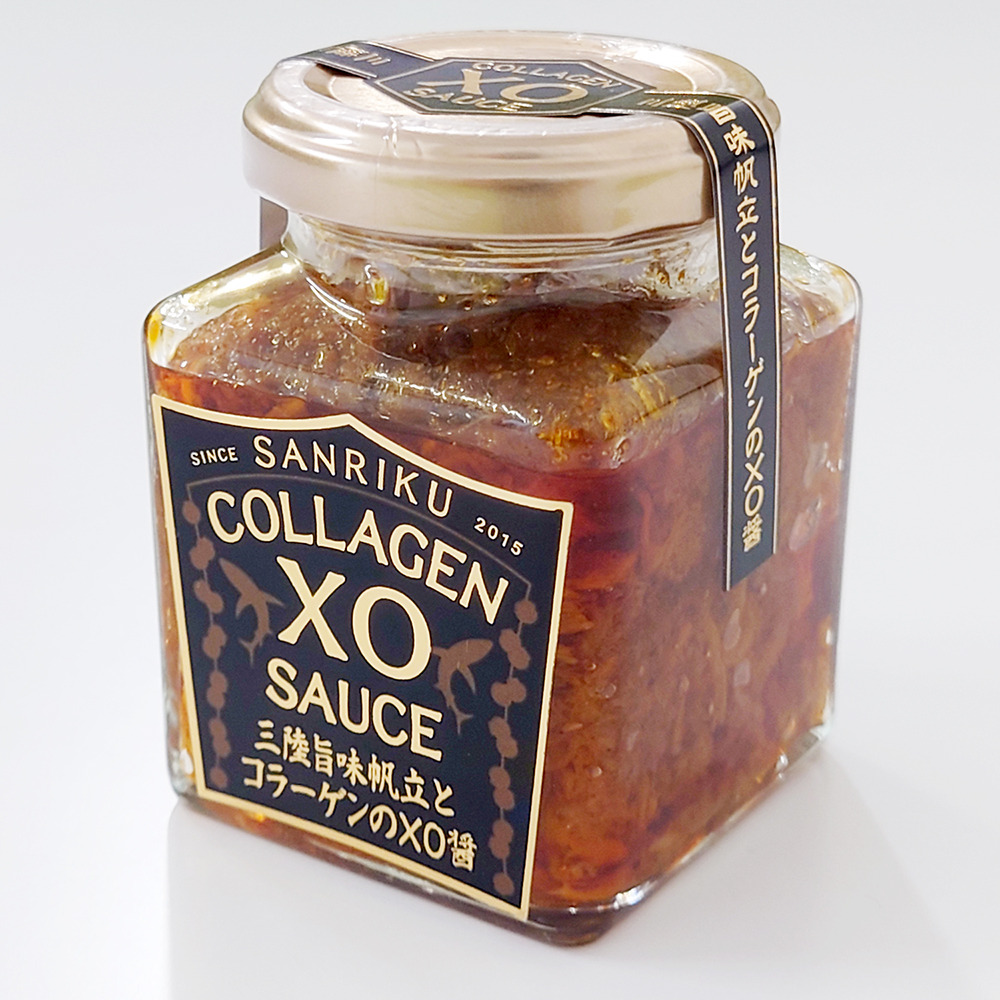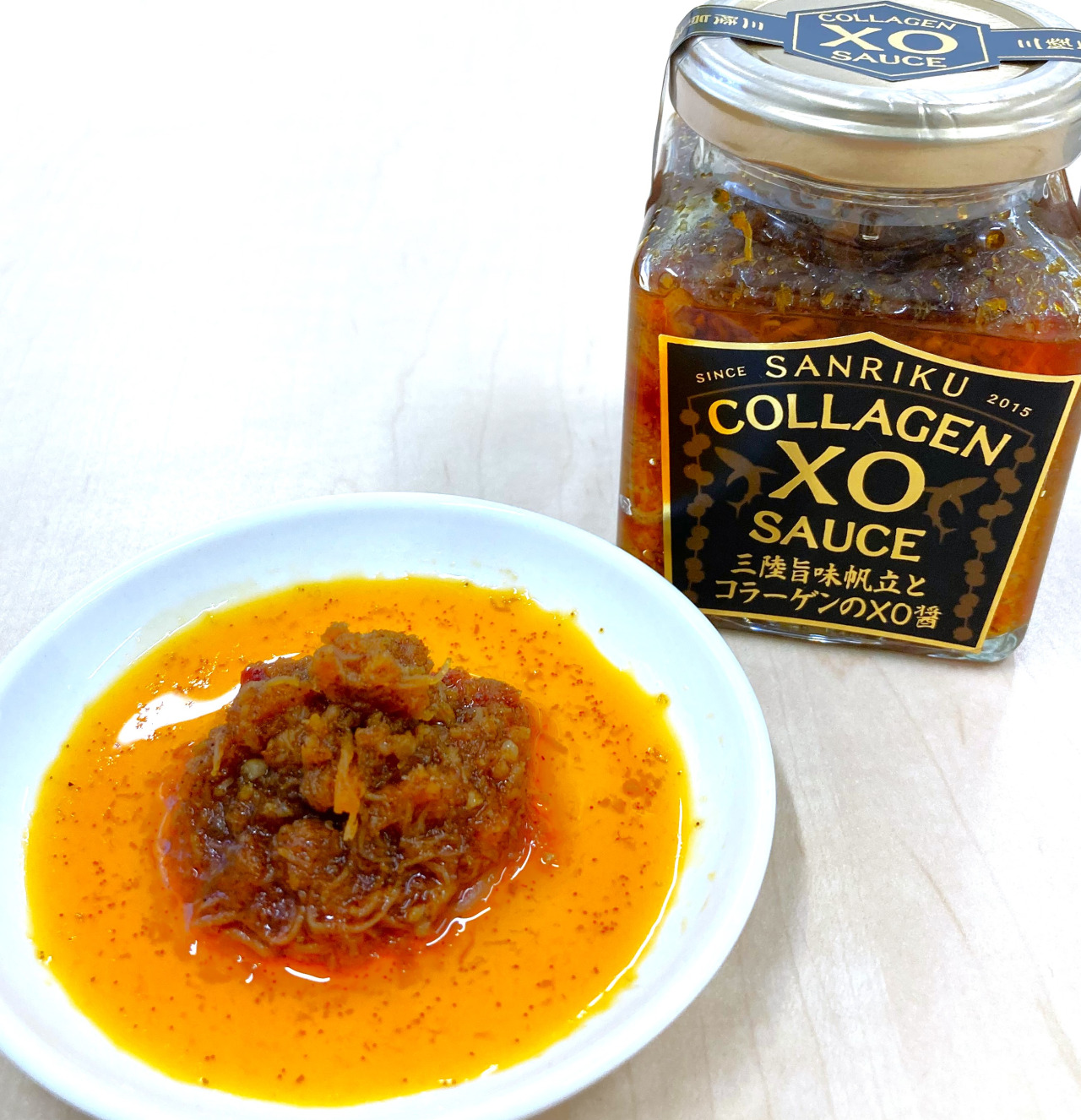 三陸産ホタテは旨み成分のグリコーゲンが多いため、乾燥させると旨みが凝縮され良質の干し貝柱に。でも形が崩れやすいのが難点でした。この良質な素材を活かそうと、ほぐした貝柱が主原料のXO醤を開発しました。