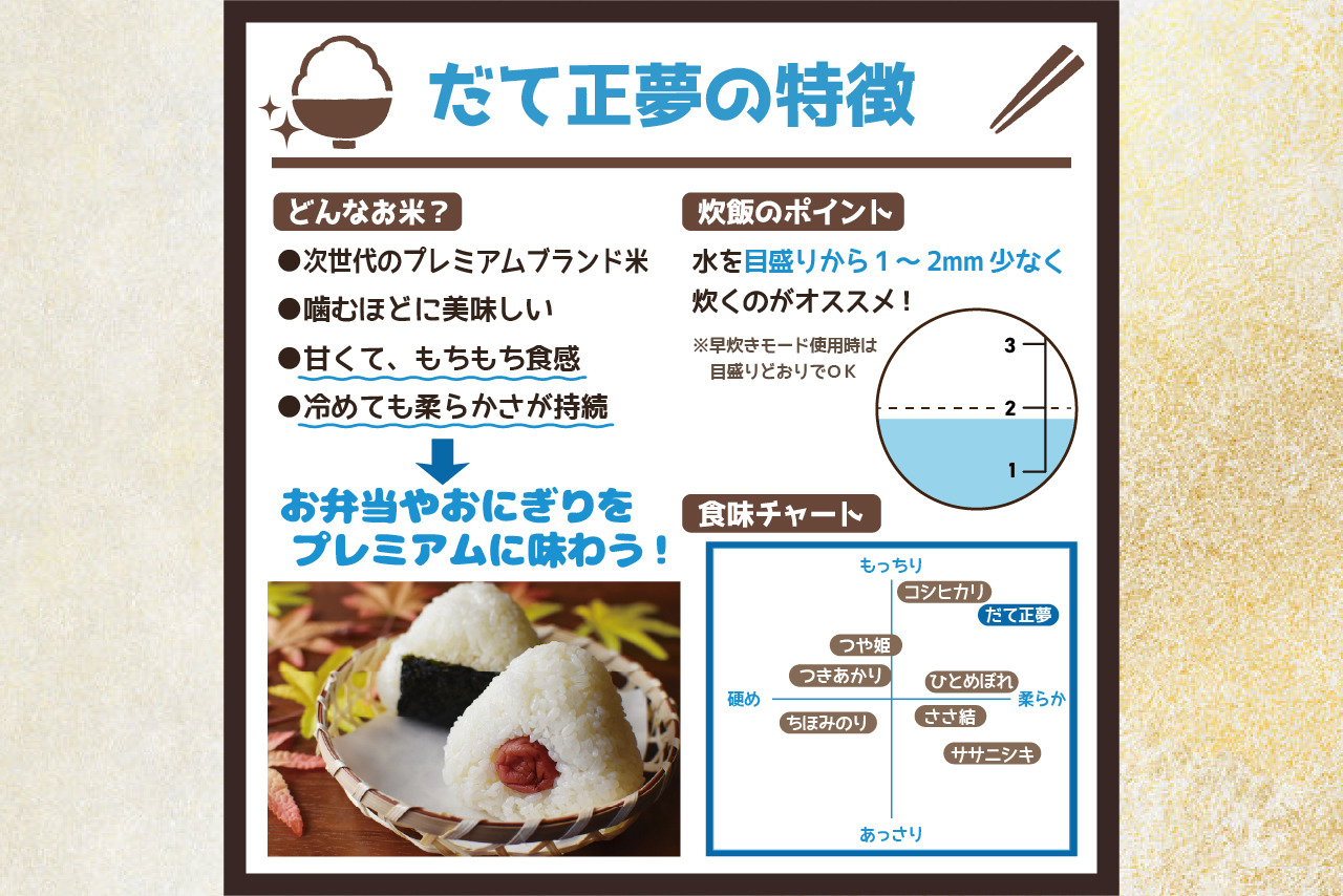 「みやぎ米の夢をかなえた、これぞ天下をとる旨さ。」 がブランドコンセプト。