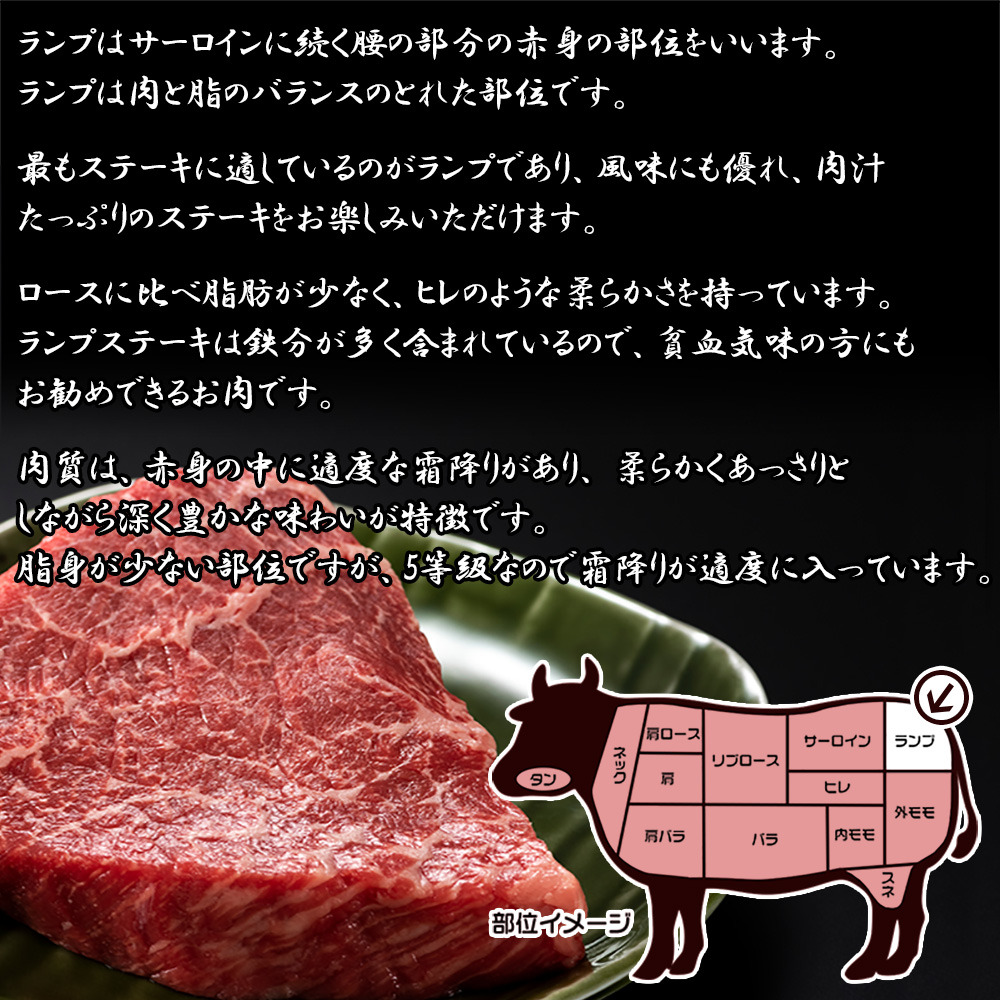 最もステーキに適しているのがランプであり、風味にも優れ肉汁たっぷりのステーキをお楽しみいただけます。 ロースに比べ脂肪が少なく、ヒレのような柔らかさを持っています。 ランプステーキは鉄分が多く含まれているので、貧血気味の方にもお勧めできるお肉です。 肉質は、赤身の中に適度な霜降りがあり、 柔らかくあっさりとしながら深く豊かな味わい です。 脂身が少ない部位ですが、5等級なので霜降りが適度に入っています。