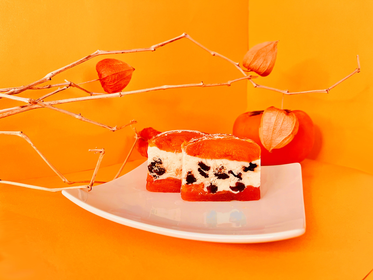 丸森産の芳醇な干柿にクリームチーズやクルミ、ラムレーズンをサンドした冷たいお菓子です。