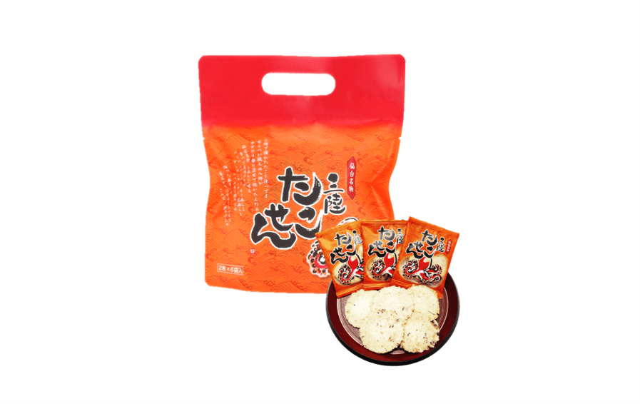 - 三陸のたこを練り込み、塩竈の藻塩で味を調えました。熱い鉄板で挟んで焼き上げ、上味に秘伝の甘辛タレでコクをつけ仕上げたおせんべいで…