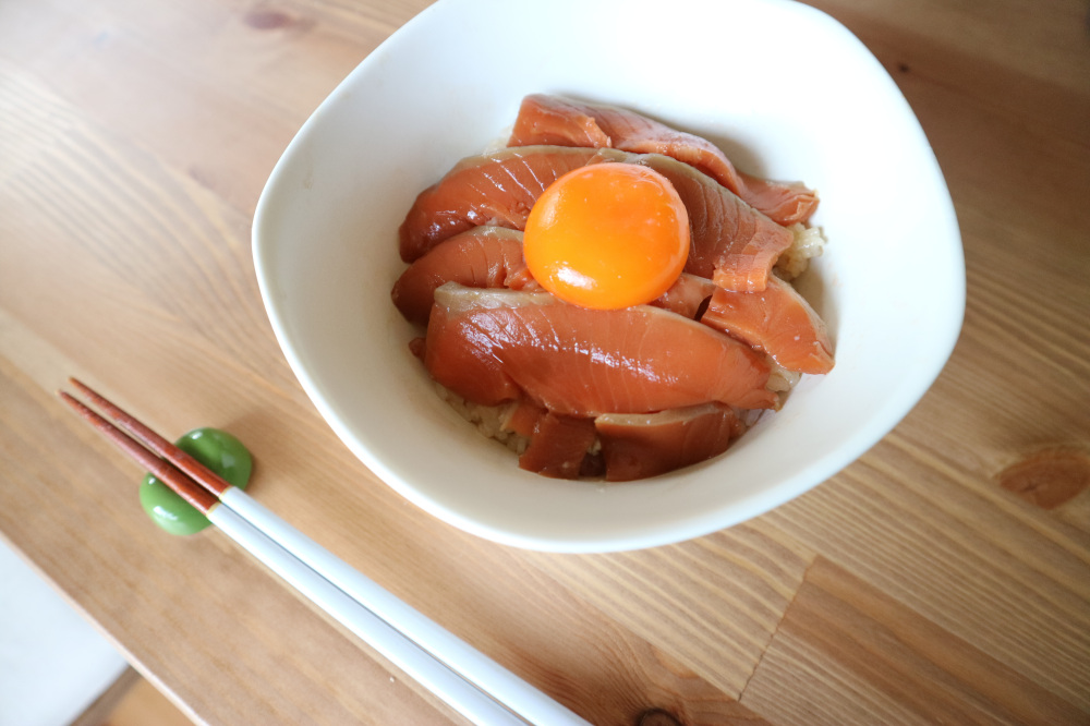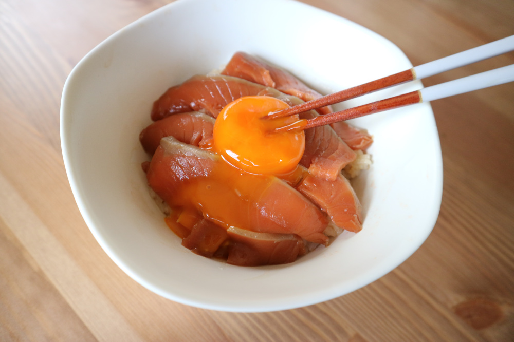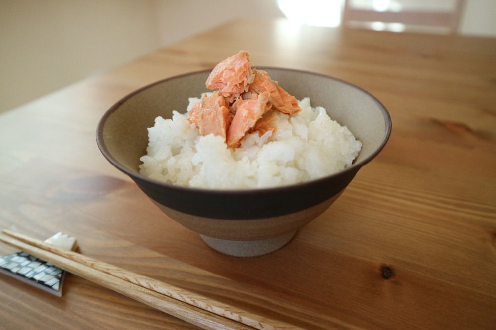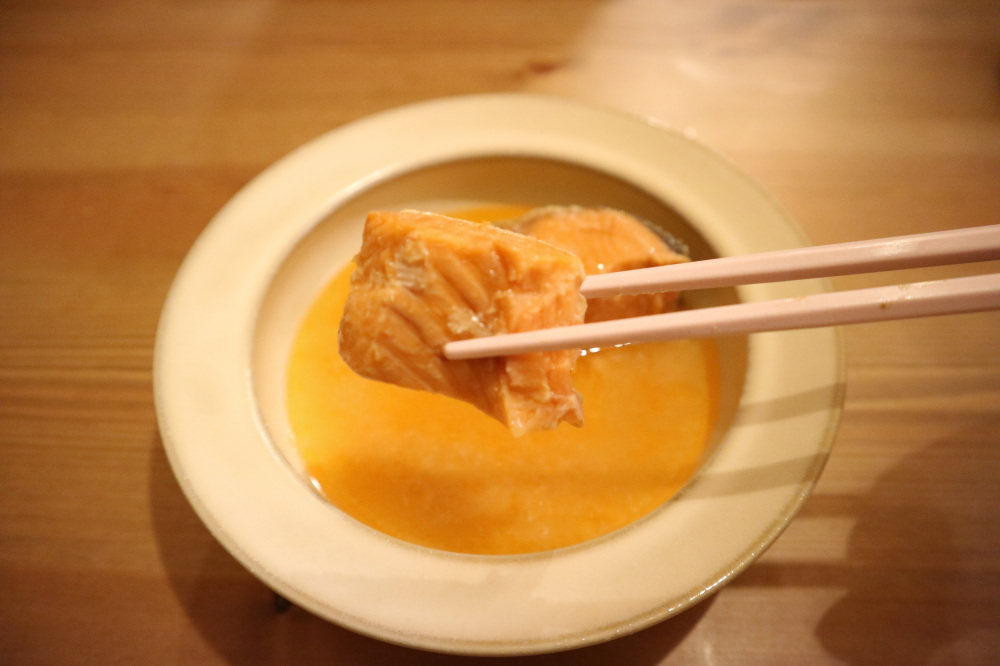 サーモンの鮮やかなオレンジ色が染まるほどしっかりと漬け込まれているので、ごはんやたまごとの相性は抜群です。ついつい、普段の倍くらいのご飯を食べてしまいました。