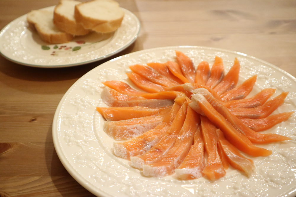 解凍したら、大きな一枚身を薄くスライス。用意している段階から、燻しの香りがふわっと広がり、食欲をそそります。