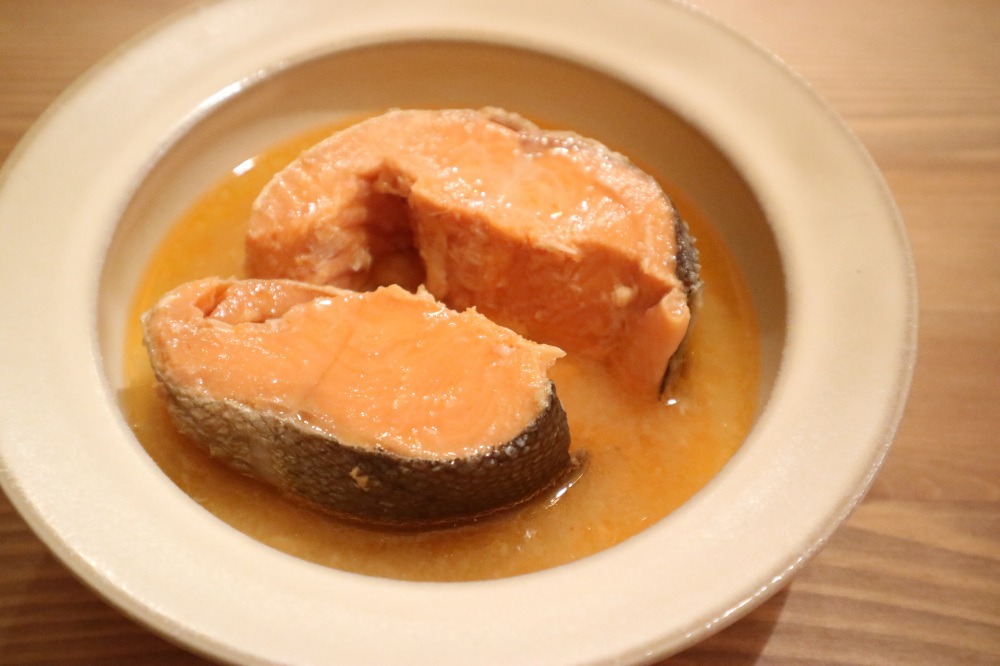 原料に使われているのは、脂がのったお刺身用のギンザケ。身がやわらかく、缶詰にするには扱いが難しい素材ですが、老舗缶詰メーカーの技術で、煮崩すことなく美しいかたちに仕上げられています。
