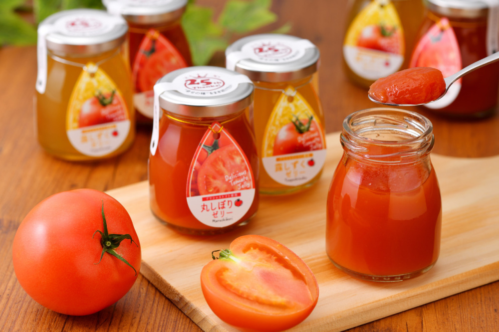 - デリシャストマトを絞ってゼリーにした『丸しぼりゼリー』と、時間をかけて丁寧に旨味エキスを抽出した「露しずくゼリー」。シャーベットも新しく発売されています。