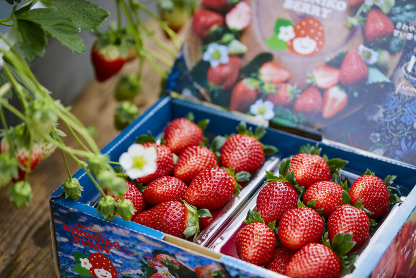 美しく整った円錐形と、断面まで鮮やかな赤色が特徴で、果皮・果肉は適度な堅さがあり、甘みと酸味のバランスが絶妙なので、そのまま食べるのはもちろん、スイーツにも最適です。「作り手、売り手、食べる人、全ての人が笑顔になるように」という願いが込められて「にこにこベリー」と名づけられました。