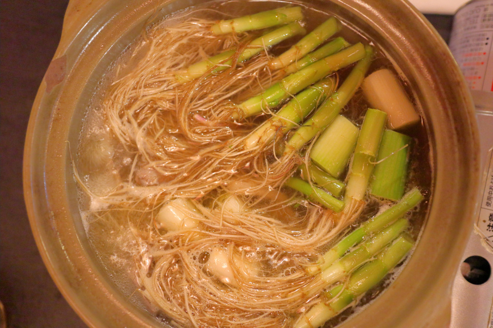 ③鶏もも肉、ゴボウを入れ、アクを取り除き煮込みます。鶏もも肉に火が入ったら、せりの根、長ネギ、豆腐などを加え軽く煮込みます。