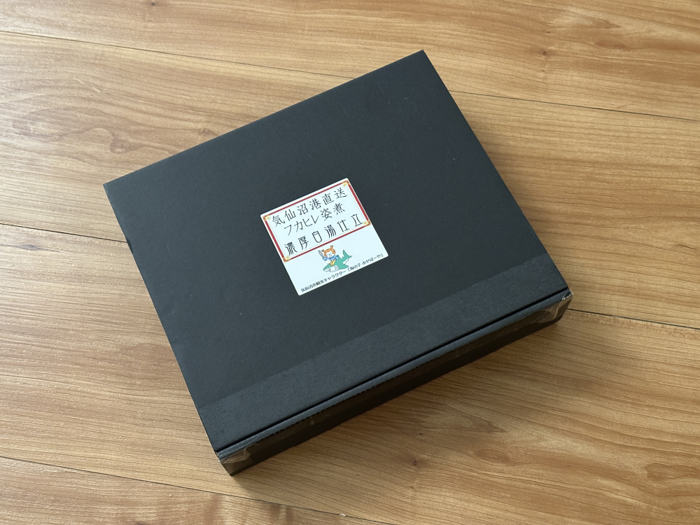 シックな黒い箱には、サメに乗る気仙沼市観光キャラクター「海の子 ホヤぼーや」の姿が。