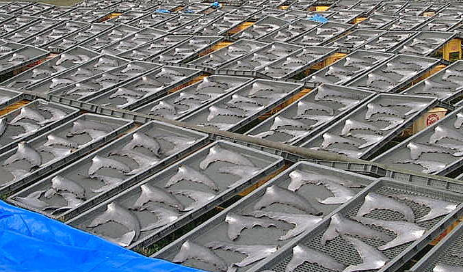 美しい形と繊細かつしっかりと際立つ繊維が特徴の高級ヨシキリザメの背ビレを、気仙沼の寒風で約2か月弱もの間天日干しします。1枚1枚手作業でひっくり返したり、雨や雪に当たらないように、しまったり広げたりと管理も大変。寒風にさらされて旨味がぎゅっと詰まったら、一晩お湯につけて繊維以外の部分を手作業で丁寧にそぎ落とします。この作業をなんと1週間もの間繰り返し、ここまでの工程にかかる時間が約1,440時間にも及ぶとのこと。ここまでの手間暇をかけて、やっと細やかな繊維のフカヒレが出来上がるのです!