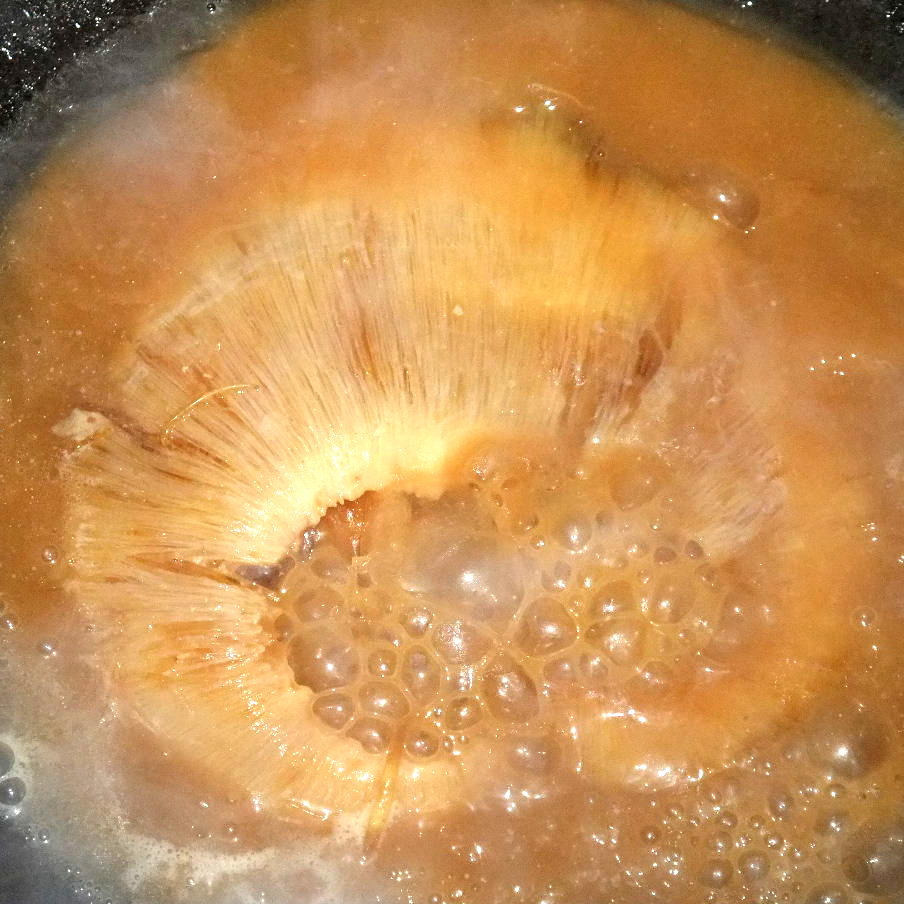 ④その後フカヒレの姿煮の上にスープを注ぎ入れて、強火で加熱し、スープが半分くらいになるまで煮詰めて完成!