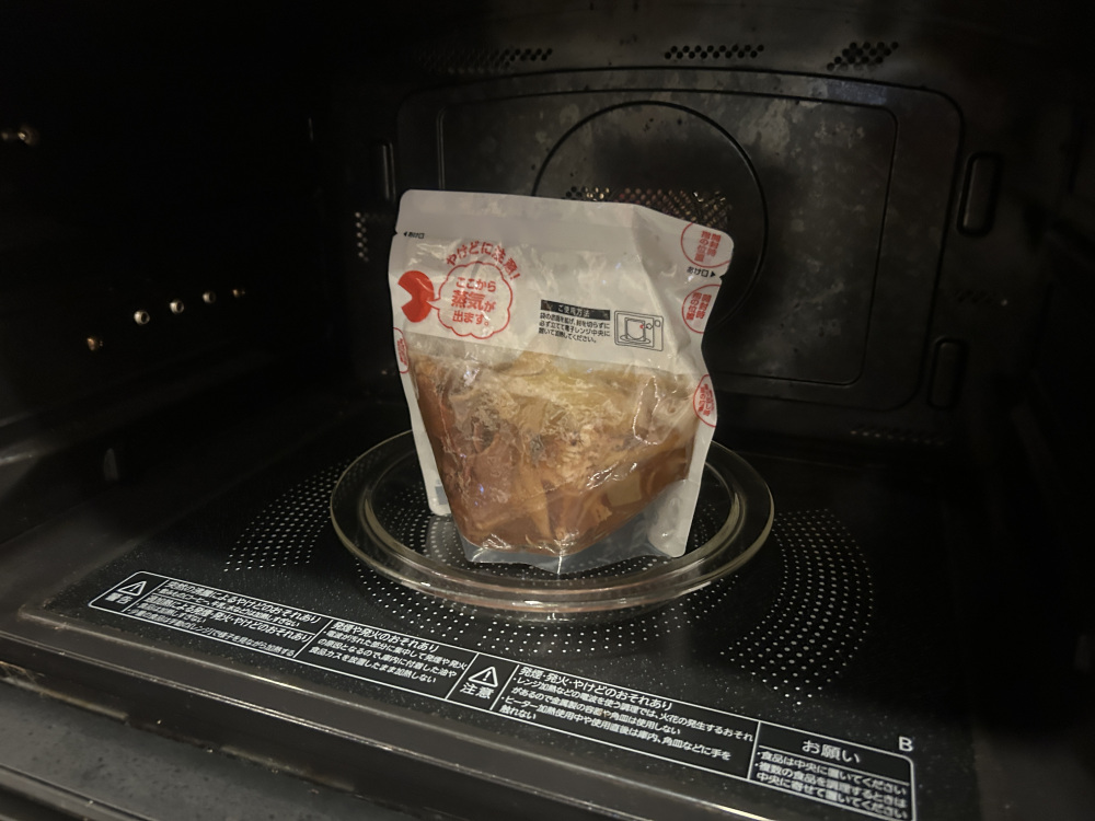 まずはパックをレンジで温めます。袋の底面を拡げ、電子レンジ中央にセットします。蒸気口がついているので封を切らずにそのままでOK!