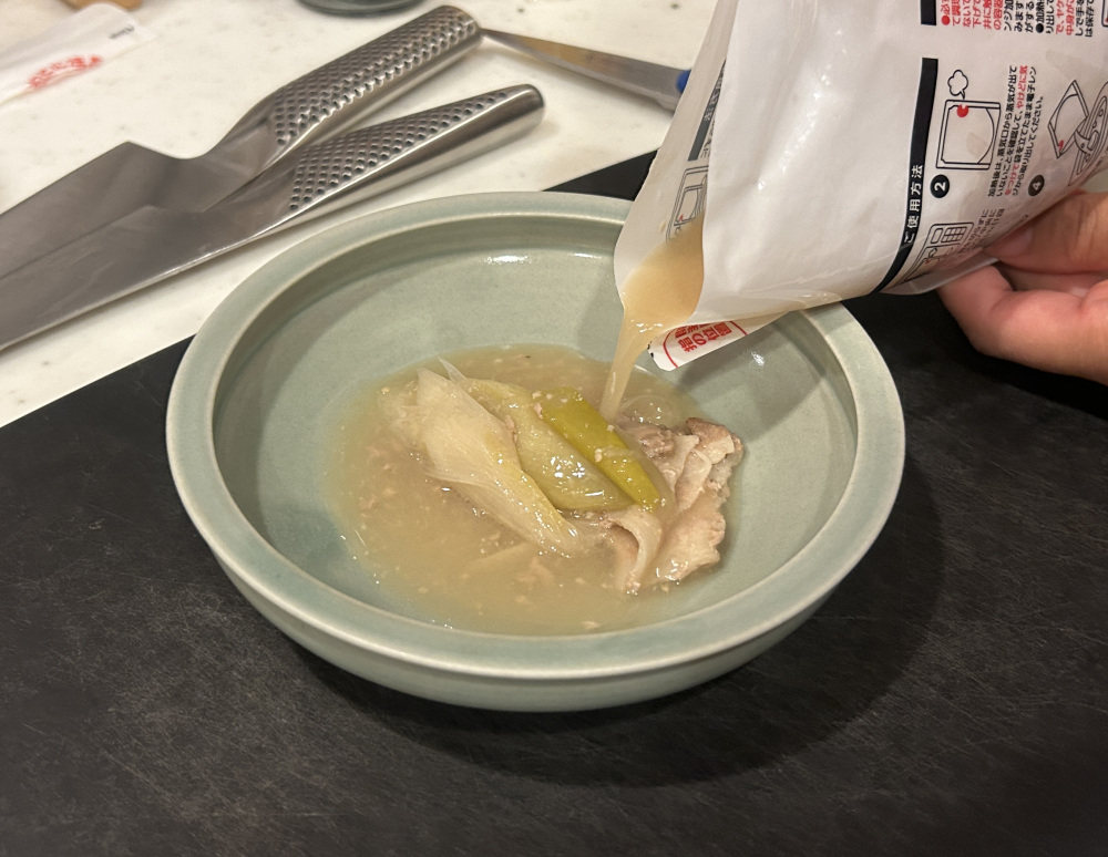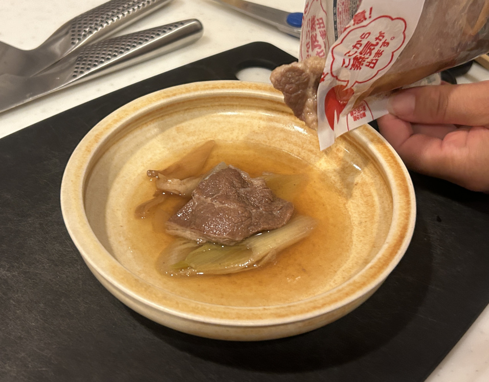 レンジから取り出し器に移します。宮城県の芋煮は味噌のふんわりやさしい香りが漂います。「東松島長寿味噌」の味噌が使われているそうで、白っぽい汁が特徴ですね。