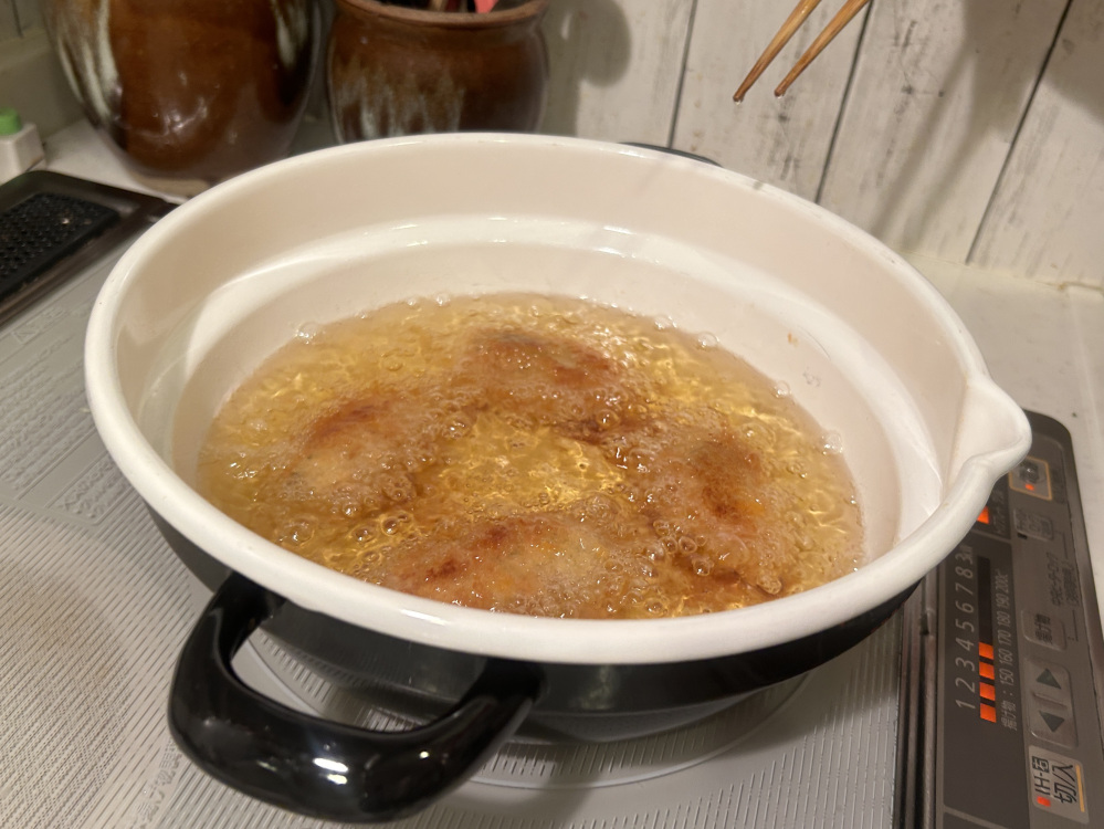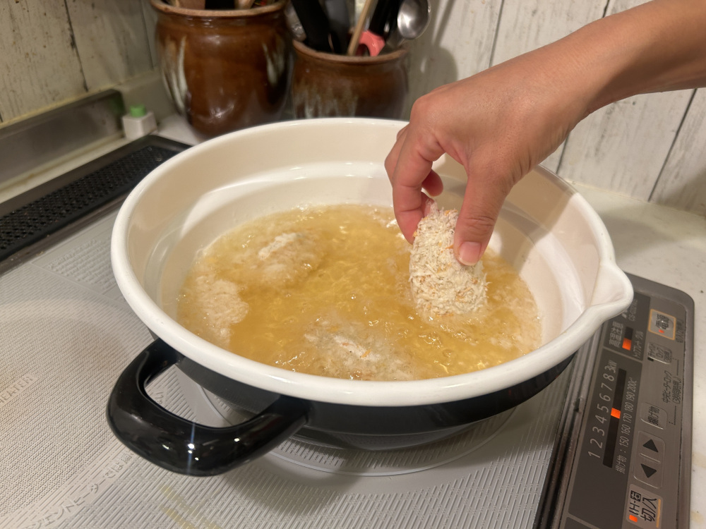 ジュワーッ!と食欲をそそる音が響き渡ります! 音だけではなく、キッチンに広がるのはパン粉の香ばしい匂いとほんのり漂う磯の香り♪なんとも食欲がそそられる時間です。