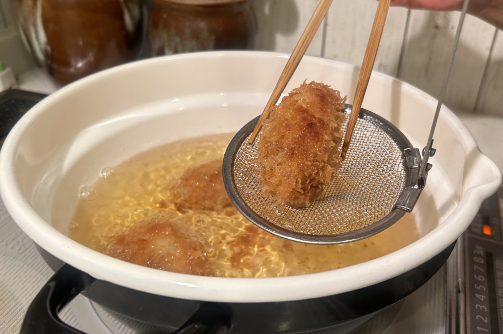 170℃~180℃に熱した油に、凍ったままのカキフライをそっと投入していきます。 一気に入れると油の温度が下がってしまうので、数個ずつ揚げるのが美味しく仕上げるコツです。