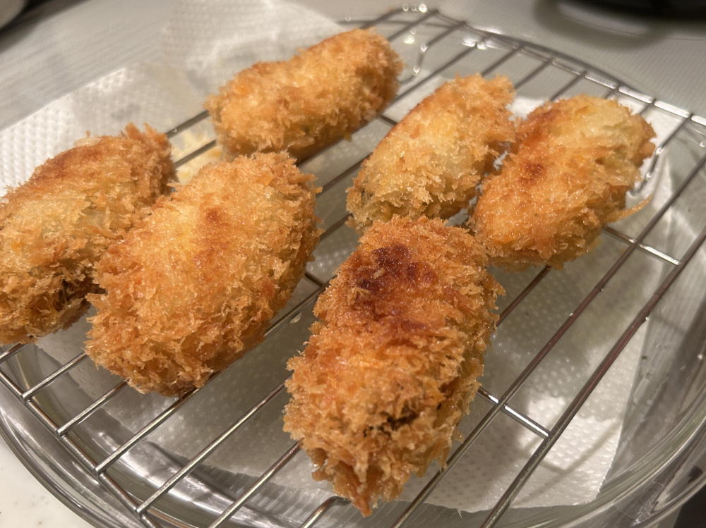 待つこと約5~6分。 カキフライ全体が、見事なこんがりきつね色になりました。