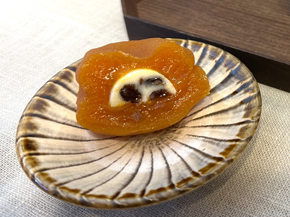 ころ柿のねっとりとした甘みに、バターの塩気とコク、そしてレーズンの酸味が絶妙にマッチ!口の中の体温でバターがふわりと溶け、柿と混ざり合う瞬間はまさに至福。一気に洋風の高級デザートに進化しました。お茶との相性が抜群なのはもちろんのこと、ウイスキーやワインのお供にも最強のパートナーになってくれそうです。夜の大人時間にちびちび楽しむのもお洒落ですね!